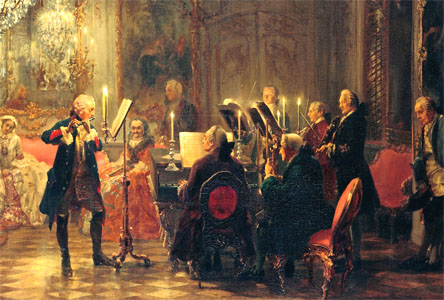 Frédéric le Grand est passionné de musique. Il prend des cours de flûte avec Quantz bien avant de devenir Roi de Prusse. De nombreux musiciens sont attachés à sa cour, aux côtés desquels il se produit en tant que flûtiste dans son palais de Sans-Souci, et compose même plus de 100 sonates pour la flûte ! Jean Sébastien Bach lui dédiera sa célèbre "Offrande Musicale"