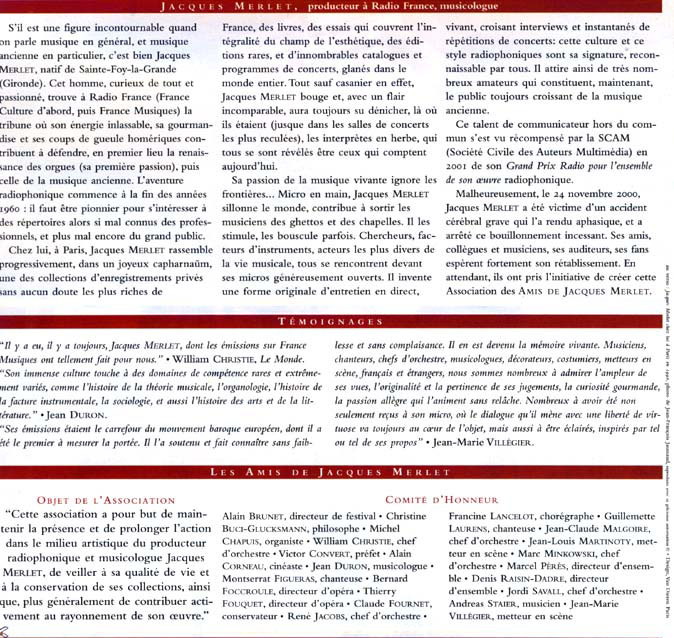 Passionné de musique et homme de radio, il œuvra pendant trente ans pour le renouveau de l’interprétation de la musique baroque et des orgues anciennes. Son nom restera associé à l’émission de France Musique Le Matin des Musiciens et à la présentation des cantates de Bach chaque dimanche matin sur cette même antenne. Que cette modeste page lui rende hommage.