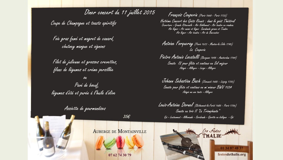 Au Programme des oeuvres de Dornel, Couperin, Locatelli, JS Bach, Forqueray, sous forme d'intermèdes musicaux au cours d'un repas.